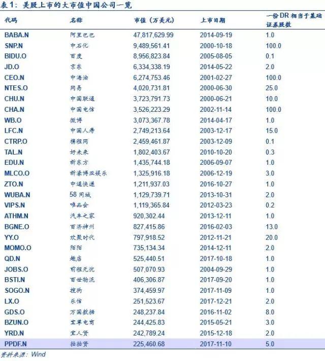 根据美国证监会的规定,注册地在海外的公司不能在美国直接上市,因此采取美国存托凭证ADR的方式进行IPO。典型代表如阿里巴巴、百度(BIDU.O)、京东(JD.O)等公司,1份存托凭证ADR可以代表1股的普通股,也有的公司采取不同的兑换比例(表一)。
