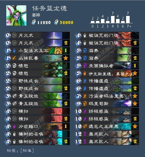 主要斩杀手段当然还是做完任务之后一套真菌之王+大蓝龙+无面+双月火+双横扫的斩杀,奥术巨人的作用除了防对手用脏鼠拖拽大蓝龙外,还可以协助完成任务,毕竟卡组里常规做任务的手段只有2张“被诅咒的门徒”完成4个进度,如果用无面复制门徒(或者用真菌之王累加召唤门徒),可能都会影响最后斩杀;如果拖到10费用“终极赖皮”做完任务,对手很可能会在10费之前抢死,而且赖皮抽5张牌实在太容易爆掉任务奖励了(说多了都是泪)。