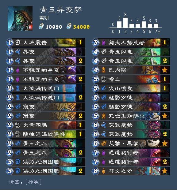 从卡组构筑和实操来看,雪妍姐姐非常清楚自己想要什么,因为卡组不是要依靠青玉致胜,而是异变或嗜血的,所以果断放弃了常见青玉萨里必带的“低语元素”和必满编的“狗头人拾荒者”, 在实操进行随从交换的时候也要按照这个原则,尽量保住自己场上攻击频率。人多才能创造奇迹。