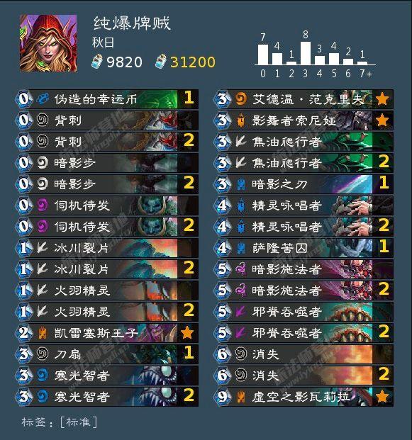 这可能是一套比较特殊的爆牌构筑,不光因为没有弑君体系,还因为二王子进入了爆牌构筑。获胜手段当然主要还是爆牌体系,火羽精灵是用来配合打连击的,暗影施法者、影舞者、暗影步和消失可以全力配合大哥过牌,但是这套盗贼碰见奥秘法和快攻骑士的*牌套**会特别困难。