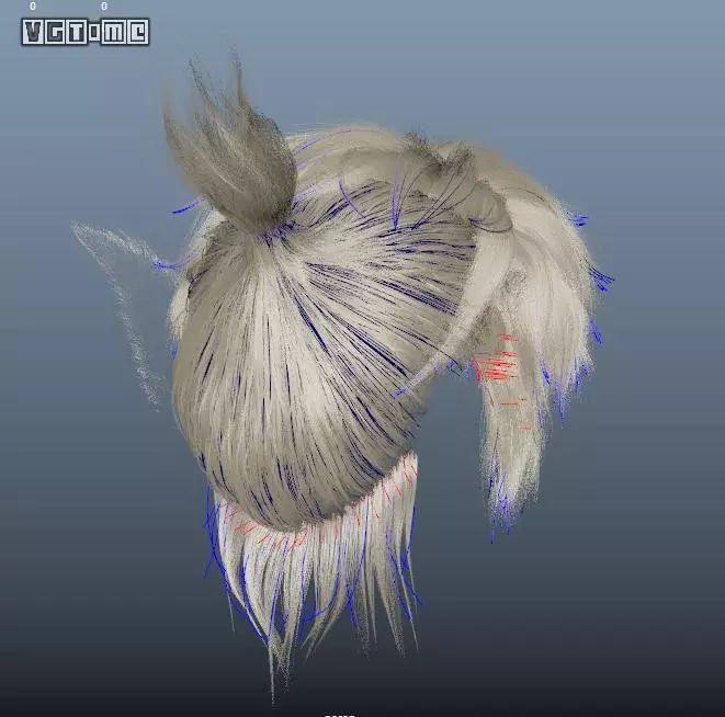 渲染流程中用毛发系统制作的毛发(如下图),虽然这只是非渲染状态下的效果,但也可以直观的感觉到游戏在游戏在发量上,在高光上,在发梢的细腻度上都还有差距,毕竟只要使用贴图,就有像素限制,现在主流的做法是用色彩的变化,以及种类的丰富度,配合插片时技巧,去掩盖问题。随着硬件提升,支持的贴图尺寸越来越大,效果也越来越好,但只要还使用贴图,距离客观事实就隔了一层。