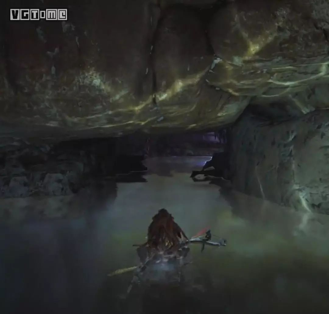 再比如《地平线 零之曙光》对水的表现(下图),虽然很用心地做了光线经水面反射后投在顶部石头的光斑,而且是是可动的,但水面其实是静止的,身边的水花也是一个简单的特效,不可能反射出可动的光斑。这层光斑是做在石头材质上的假效果。