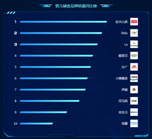 从品牌销量同比榜单来看,农夫山泉、little、La分列婴儿辅食销量同比榜单前三,增速最快;排名稍靠后的河马莉、合生元等品牌的市场占比也在稳步上升中。