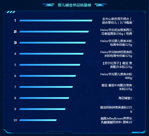 再来看单品销量榜,农夫山泉婴儿水、亨氏Heinz优加营养西兰花香菇面条、 亨氏Heinz婴儿营养米粉、嘉宝(Gerber)草莓苹果味星星米饼、 Heinz亨氏番茄酱等销量一直排名靠前,其中亨氏多款爆品榜上有名。