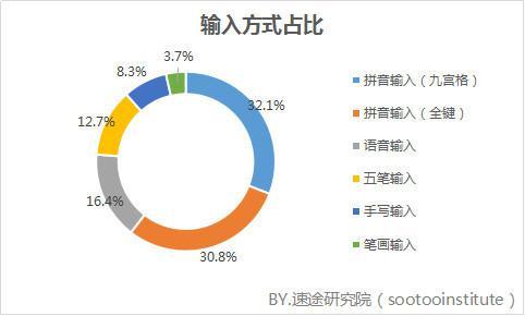 但是,据雷锋网了解,目前用户的输入习惯主要还是以拼音输入为主。速途研究院的数据显示,六成多的用户还是选择拼音输入,其中九宫格拼音输入最接近用户的输入习惯,可以单手掌控输入。