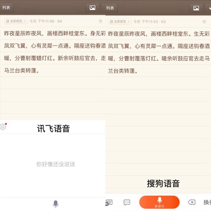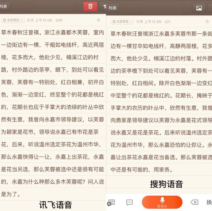 讯飞语音可一次性不间断输入249个字,搜狗语音可输入221个字。整体来看,讯飞识别率更高一些。