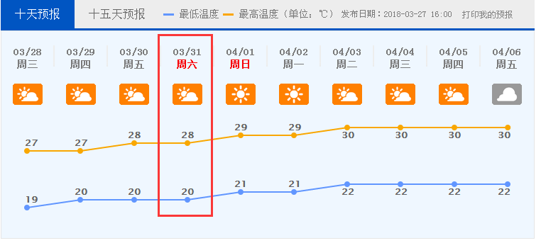 3月31日(周六) :多云到晴,气温20℃至28℃。