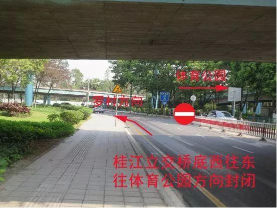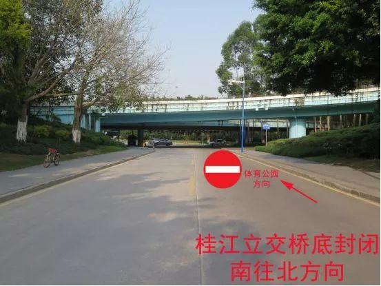 7、桂江立交桥底桥南往北、西往东往体育公园方向封闭,禁止车辆由桥底进入体育公园。