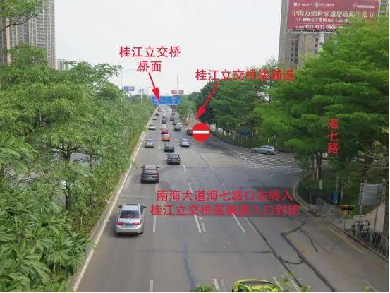 10、南海大道海七路口右转入桂江桥底辅道入口封闭。