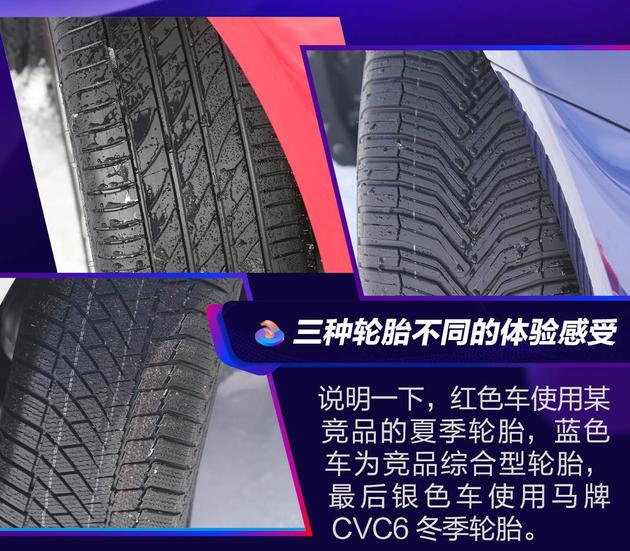 三种不同属性的轮胎放在一起即可观察到,冬季轮胎的胎面花纹具有更高的刀槽密度,抓地力更强,其花纹采用非对称设计,胎肩花纹与胎面筋条连接,可以确保车辆精确的转向及制动能力。上图左下方为马牌CVC6冬季轮胎,两支竞品在此暂不说明。