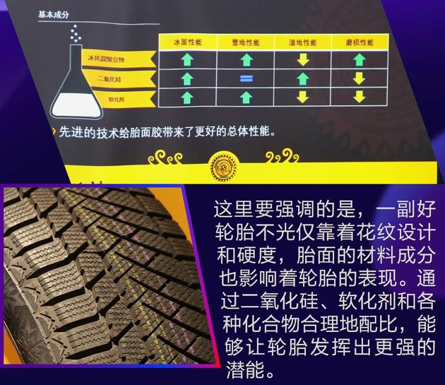 胎体材料可以保证足够的弹性,能为驾乘者带来良好的舒适性,而二氧化硅和软化剂也会使轮胎的抗磨性降低,这需要轮胎设计师针对不同属性的轮胎,合理地分配每种材料的计量,以达到最佳的平衡点。