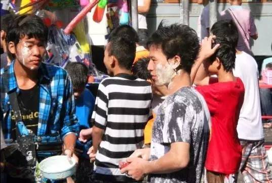 泼水节期间,考山路的商铺大都停业,但街上随处可见卖水枪、灰粉的路边摊,在街上买上一代面粉,加水后抹在脸上,寓意着对新年的祝福,停放在路边的车也免不了被涂满祝福!