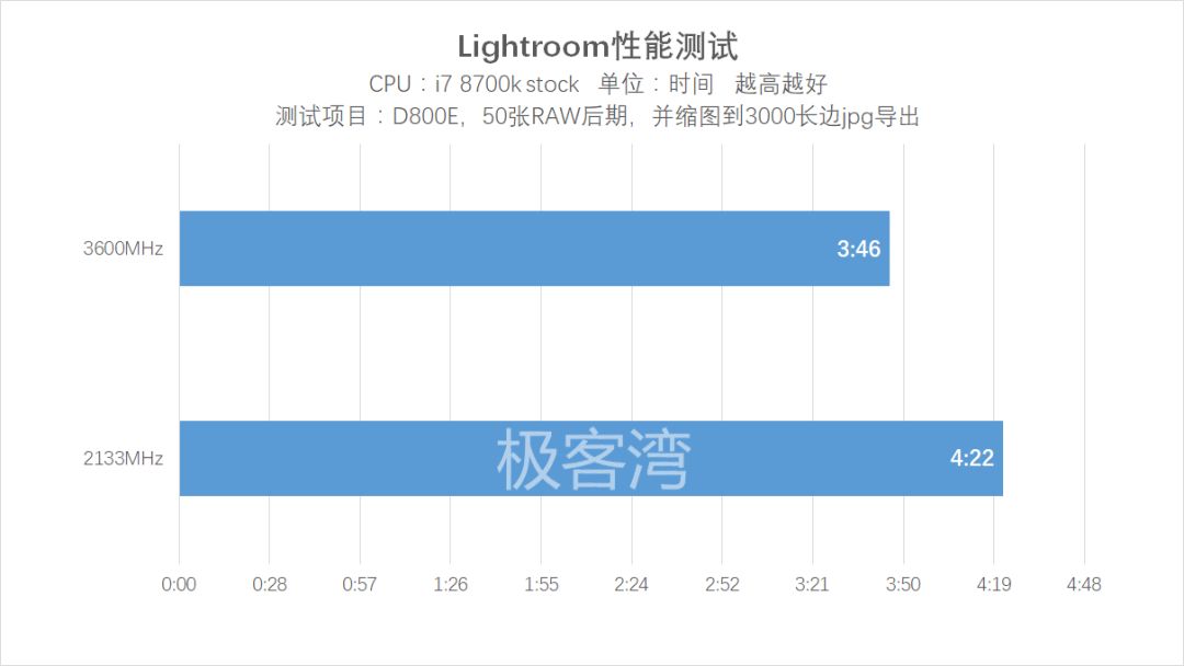 可以看到,高频内存在Lightroom中的加成是非常巨大的,所以如果像我这样有修图需求的话,还是能上多高频率就上多高频率吧。