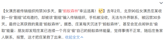 上个月,蚂蚁森林更是立功!一女演员陷入传销组织,手机被没收,无法与外界联系。最终,其朋友发现女演员一月之内没有在蚂蚁森林偷过自己能量,也没有收过自己能量。判断事情不正常,最终报警,女演员中最获救。