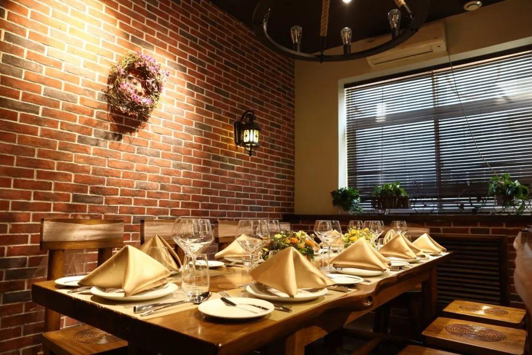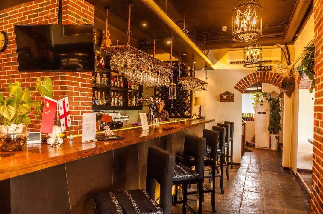 店内装修古朴典雅,红砖拱门,原木吧台经典的欧洲范儿。鹿角麻绳吊灯原始粗犷,水晶鸟笼吊灯彰显低调的奢华。造型独特的酒具和摆件或质朴或华美,充满异域风情。大幅的油画,无论暮霭下的白桦林还是朝霞中的冷杉树还是艳阳高照的雪国,都是从本土背回的画家的心血,笔触间饱含着对格鲁吉亚风光的无限热爱。