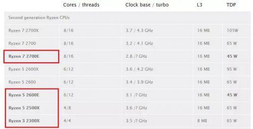 最后值得一提的是,AMD二代锐龙处理器还出现了两款新品控产品,型号为“R7 2700E”、“R5 2600E”,这也是AMD处理器首次以“E”结尾,从功耗设计仅45W来看,显然是低功耗版本,性能相对较低一些,有可能是面向移动(笔记本)市场的产品。