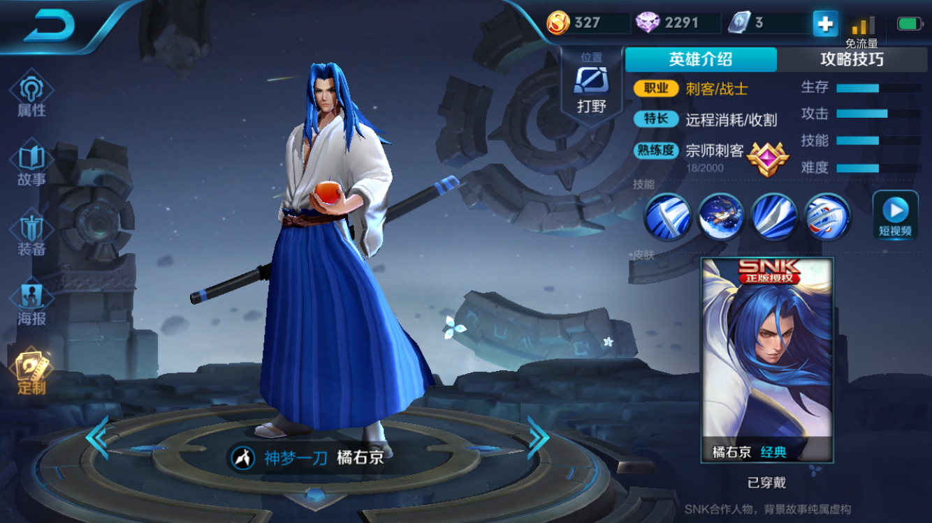 橘右京不仅仅是三个SNK英雄之一,不容易获取,而且也是非常的帅气,操作难度也不高。现版本的橘右京出场率不太景气,原因可能就是因为橘右京相对于其他战士来说,会较弱一些,不管是对线还是打野,优先级并不高。但其实小编想告诉大家,橘右京是蛮强的一个战士/刺客,对脆皮的威胁特别大。接下来小编就为大家推荐一下边路橘右京。