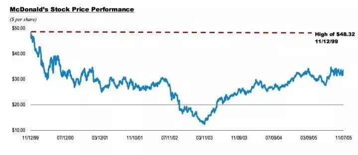 当时麦当劳刚刚走出低谷期,同店增长艰难转正,利润率慢慢回升。股价从巅峰期的 48 美金跌到了 2005 年的 30 美金上下。