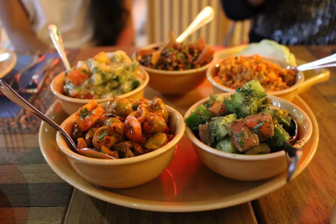 她说的可能是当地的传统饮食。和他们喷的香水浓度一样,中东的传统餐厅出品也是蛮重口味的,在黄瓜、薄荷叶、橄榄等没有沙拉酱的餐前沙拉清爽口腔之后,有着孜然和茴香味道的酸奶会被端上来。