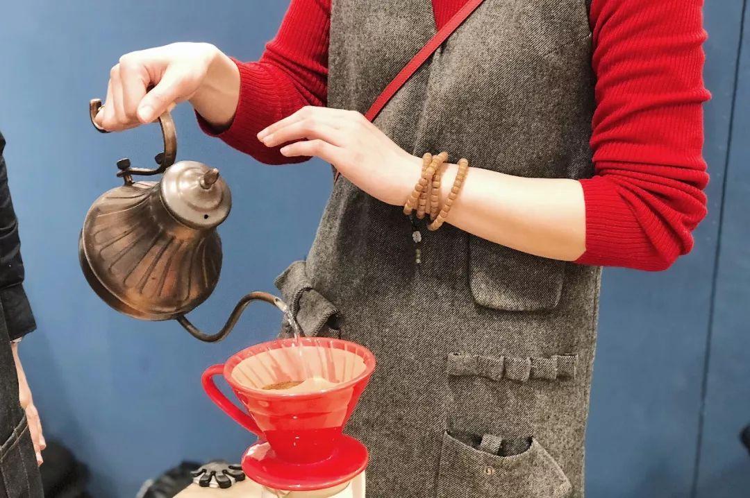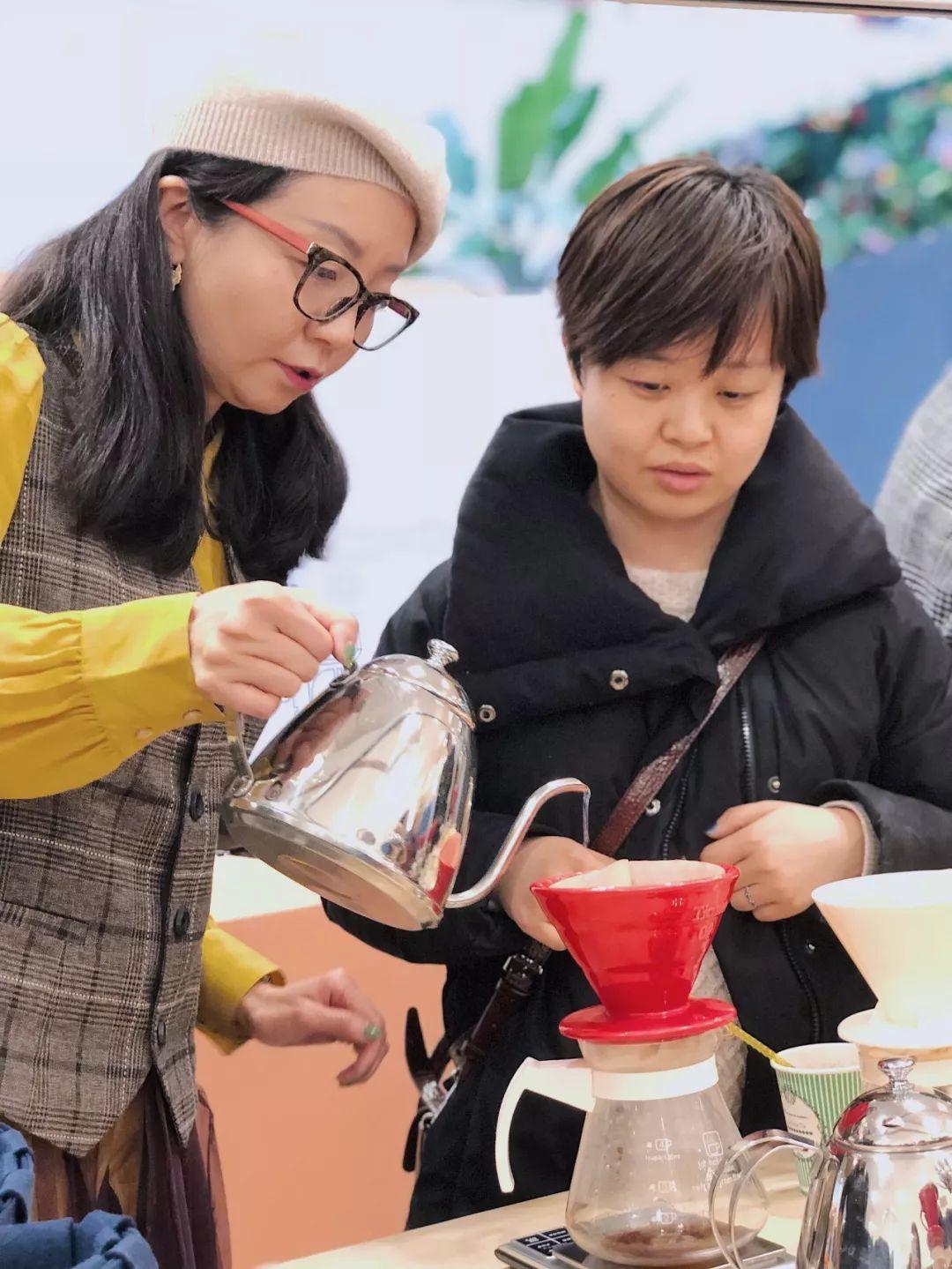手冲咖啡课的老师正在细心讲解冲制流程,帮助学员品尝自己手冲出来的咖啡。