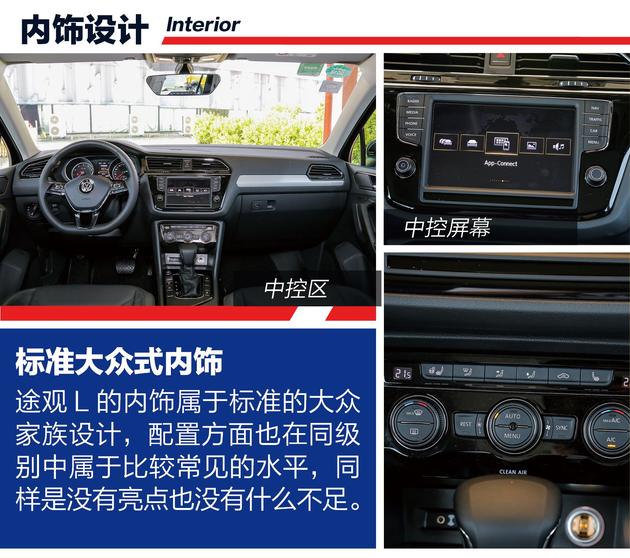 内饰上,途观L依旧保持着家族设计,很多元素都可以看出是大众车型。车辆的配置在同级别中处于较常见的水平,总之一切都看起来那么平衡。