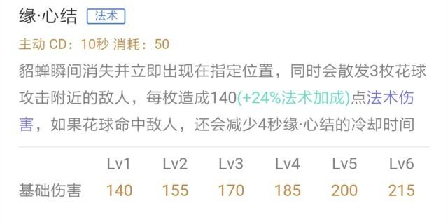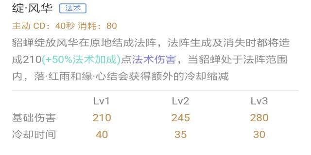 貂蝉绽放风华在原地结成法阵,法阵生成及消失时都将造成法术伤害,当貂蝉处