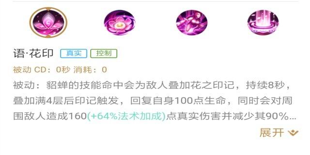 貂蝉的技能命中会为目标叠加花之印记,每四层印记触发一次爆炸,回复自身100点生命值并对周围敌人造成真实伤害与减速效果。貂蝉的关键技能,此技能要求貂蝉技能要命中敌方,要多多练习提升自己技能的命中率。