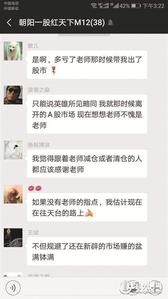 记者在群里看到,该群里有120多名群成员,群主是一个叫“朝阳老师”的人,群里还有一名助理叫“娜娜”。记者*底卧**群内发现,每天群内讨论都很热烈,不少人在说股市不景气,还有一部分人经常晒自己的“战果”,炫耀自己赚钱了:“跟着朝阳老师有肉吃”“今天就赚了7000美元”“谢谢朝阳老师的建议”“若是没有老师的指点,我估计现在正在往天台的路上”……群内聊天的诱惑性明显:给新进群成员一个信息,要跟老师炒恒指。