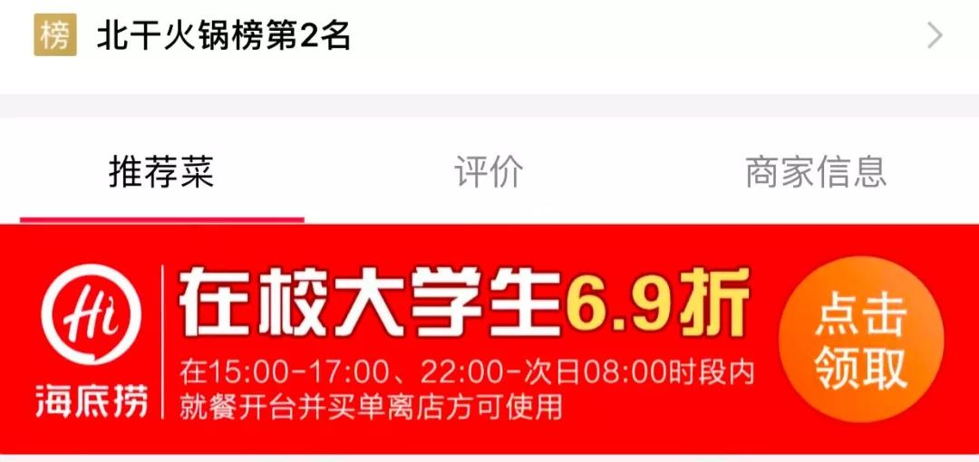 海底捞大学生6.9折优惠:如果你是在读大学生(研究生也可以),可以在支付宝或者口碑里面领取大学生折扣,然后在规定的时间段内消费可以享受6.9折,这个折扣和30元优惠券这些不能叠加,需要在支付宝里面认证学籍信息才能享受折扣。