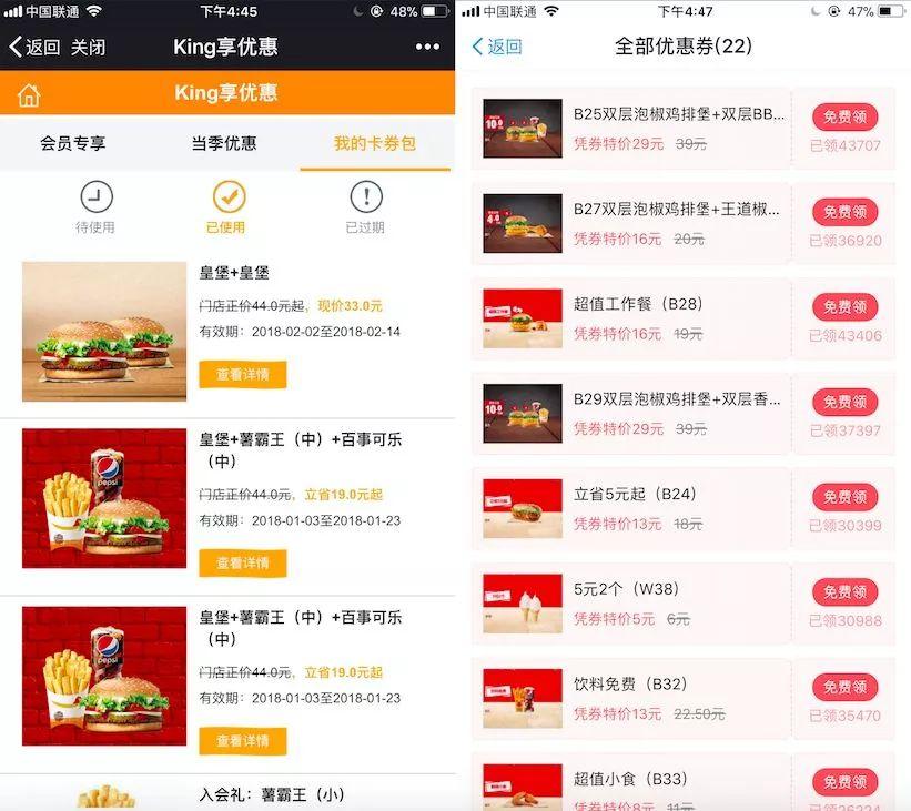 下面图片左边是汉堡王公众号,可以在当季优惠和会员专享中领取优惠券,比如我之前领过的双皇堡33元,皇堡+薯条+可乐=25元,挺实惠的,右边是口碑上领取的汉堡王优惠券,口碑上的优惠券种类和类别更多,但是折扣力度没有公众号那边大。
