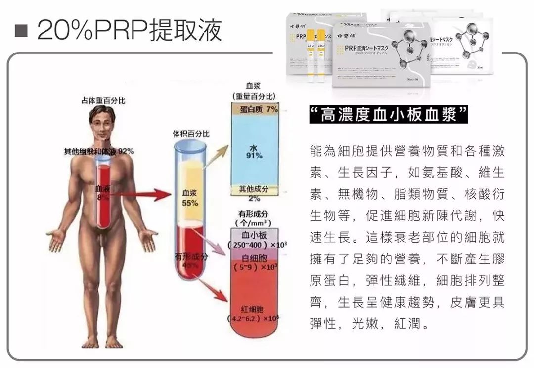 在日本,媲美微整的效果让PRP获得“科研级生物科技成果”称号,引爆科技护肤风潮。PRP就是由人体血液提取出富含高浓度血小板,其中富含9种能使细胞再生修复的自体生长因子、3种细胞粘合蛋白。