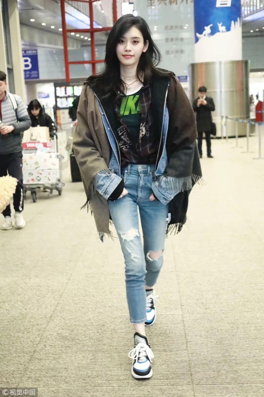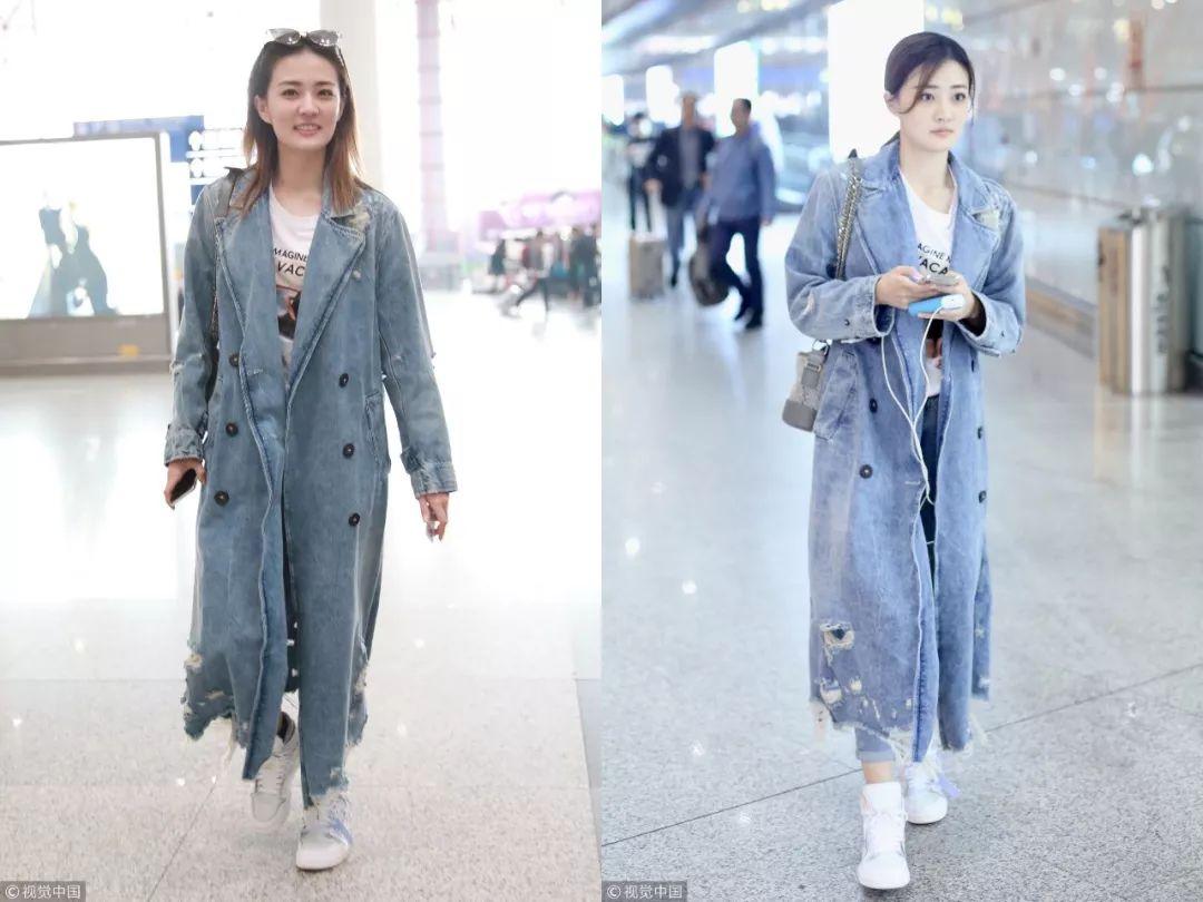 徐璐两天都是一样的搭配,破洞牛仔风衣长外套+白色字母T恤,大概真的是这个季节机场最舒适的look了。