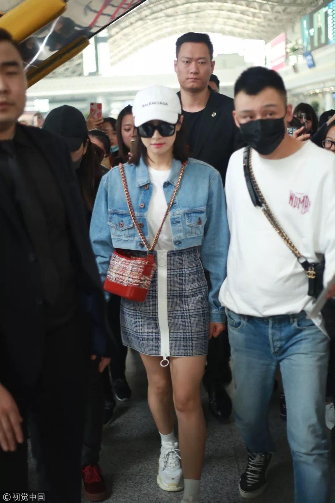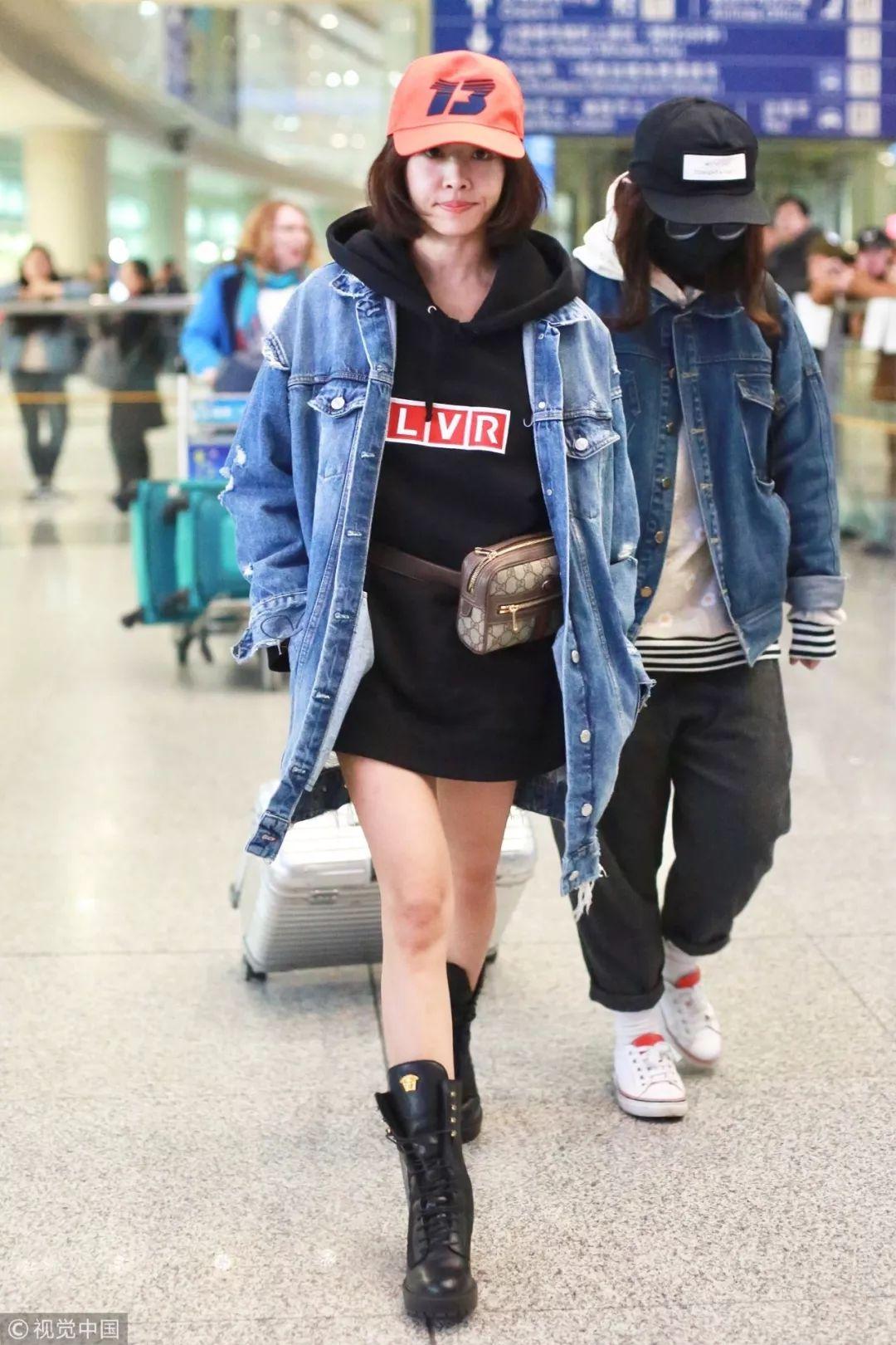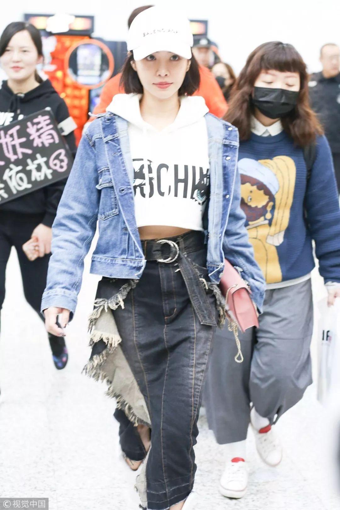 蔡依林现在绝对是机场时尚的领军人物,GU x Kim Jones牛仔夹克内搭Moschino白色露脐连帽卫衣,下身穿Christian Dada黑色毛边不规则开叉牛仔裙,脚踩Off-White白色尖头靴,继续走潮牌路线。