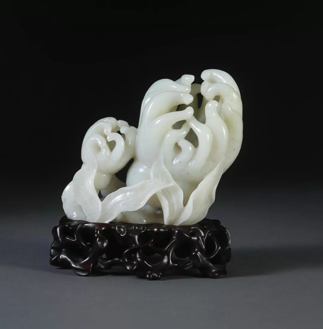 古代青铜牺尊背部承酒,身错金银纹饰,在祭祀仪式上盛酒温酒。到了明清,牺尊又成为一种吉祥的摆设,广泛陈设于书斋厅堂当中。这件玉牺尊用于文房,既可以盛水以研磨润笔,更是极为尊贵的摆设。在各种仿古器中,牺尊的工艺难度最大,不仅有外部的整体造型和纹饰工艺的装饰,还要掏空内膛,使其具有盛酒或盛水的功能。
