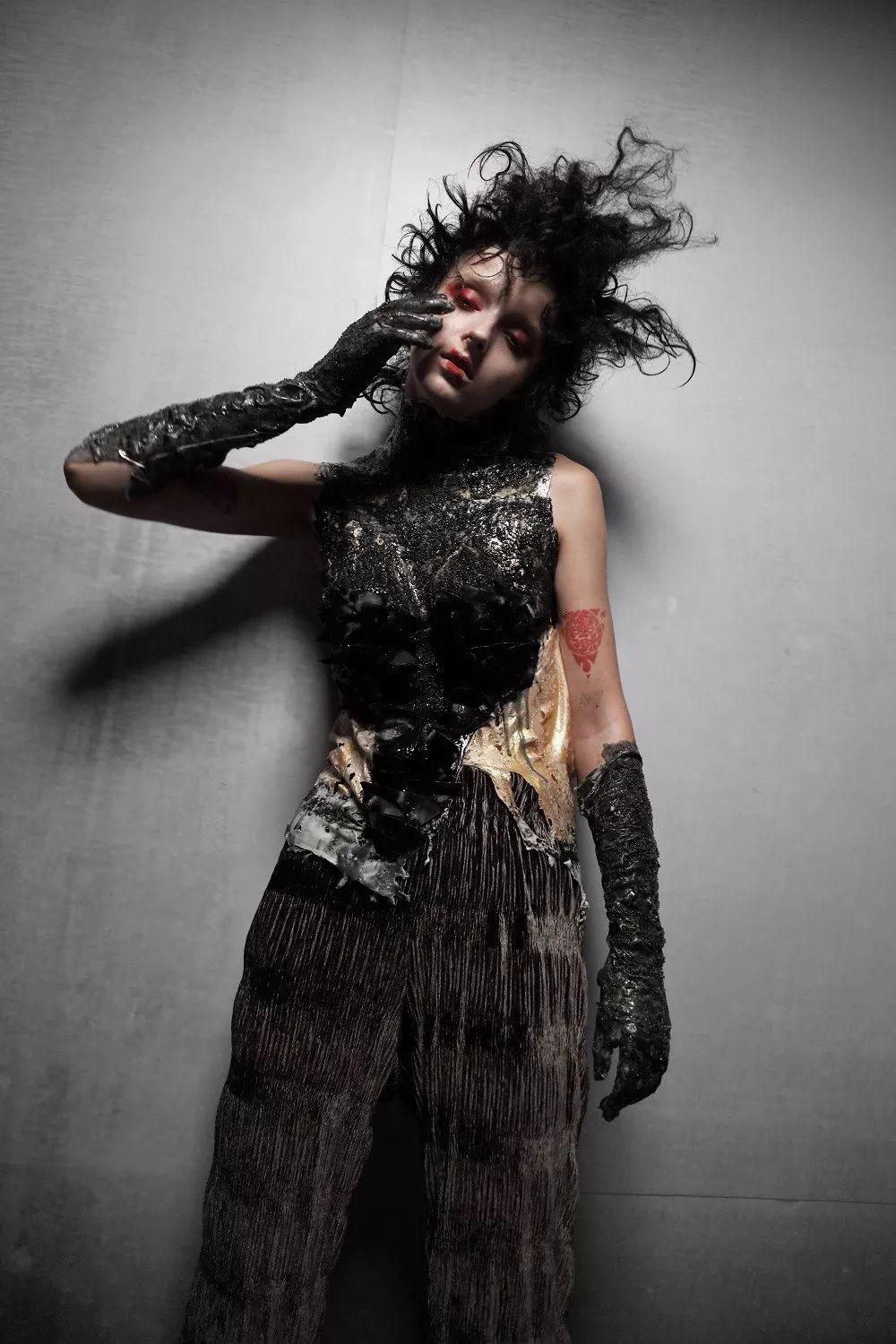 “过度保护”这个女装系列设计前卫,探讨了两个格林童话:渔夫和他的妻子、桧树。这个系列反思了儿童教育,我们是不是该保护孩子,不让他们受到成人世界行为处事的影响。这些主题体现在了“老式”形状,树皮,大量针织面料和绳子。
