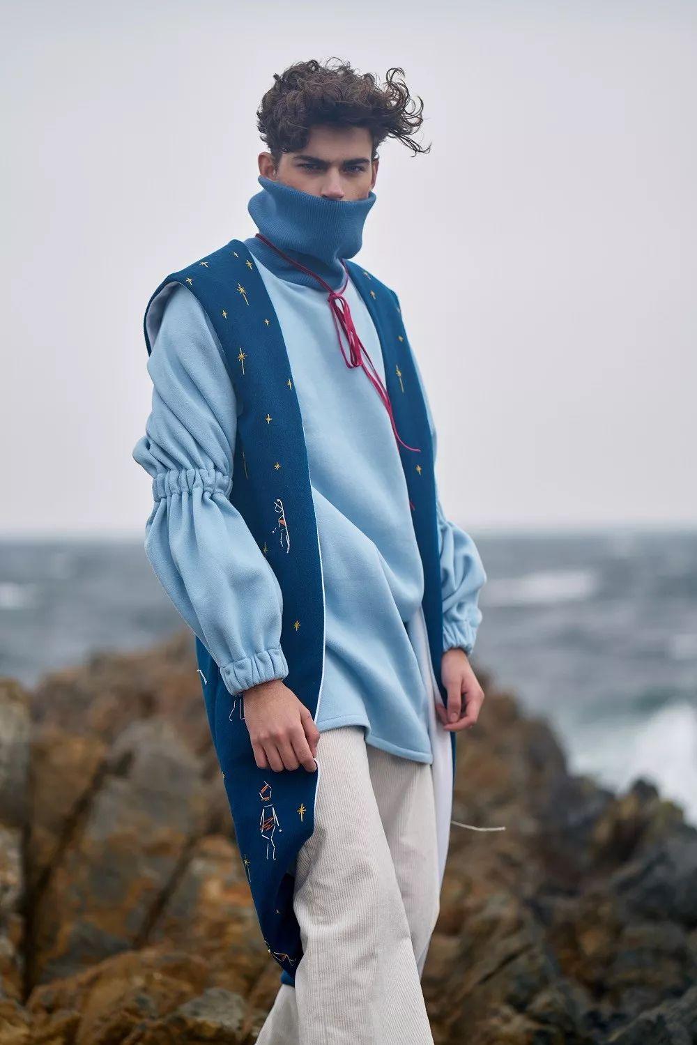 “B-612”是一款男装系列,灵感来自于漂在城市中的流离失所者就像漂浮在海中的海浪。天空和大海呈现出不同层次的蓝色。“小王子”这本书为这个冬天的穿着系列带来了浪漫色彩,主要体现在柔和而密集的纹理。