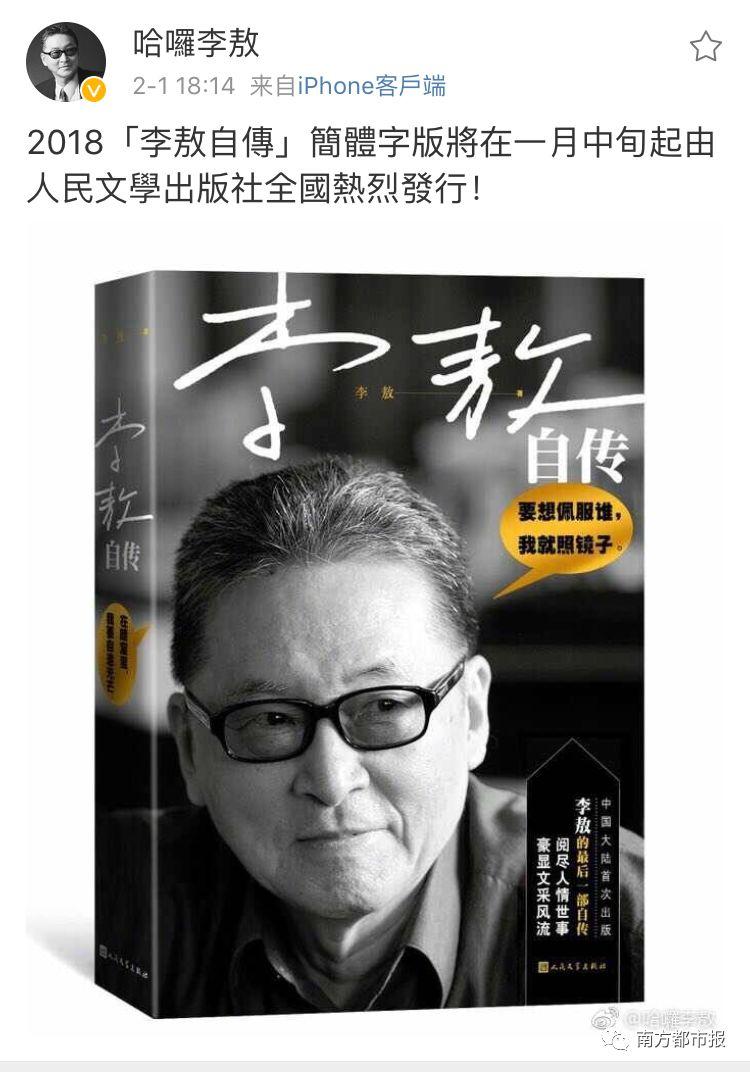 这是李敖生前更新的最后一条微博。