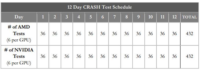 整个测试周期长达12天,每天测试6张显卡,每张显卡每天运行24小时,总计432项压力测试,最后计算通过测试的比例。
