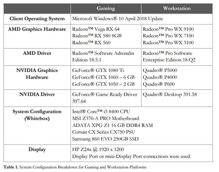 他们选择了12张AMD、NVIDIA显卡,双方各有6张显卡,其中消费级3款,专业级3款,AMD这边分别是RX Vega 64、RX 580 8GB、RX 560及Radeon Pro WX9100、Radeon Pro WX7100及Radeon Pro WX3100,NVIDIA那边则是GTX 1080 Ti、GTX 1060 6GB、GTX 1050 2GB以及Quadro P5000、Quadro P4000、Quadro P600,对应的显卡驱动分别是Radeon Software Adrenalin Edition 18.5.1、Radeon Pro Software Enterprise Edition 18.Q2以及GeForce Game Ready Driver 397.64、Quadro Desktop 391.58。