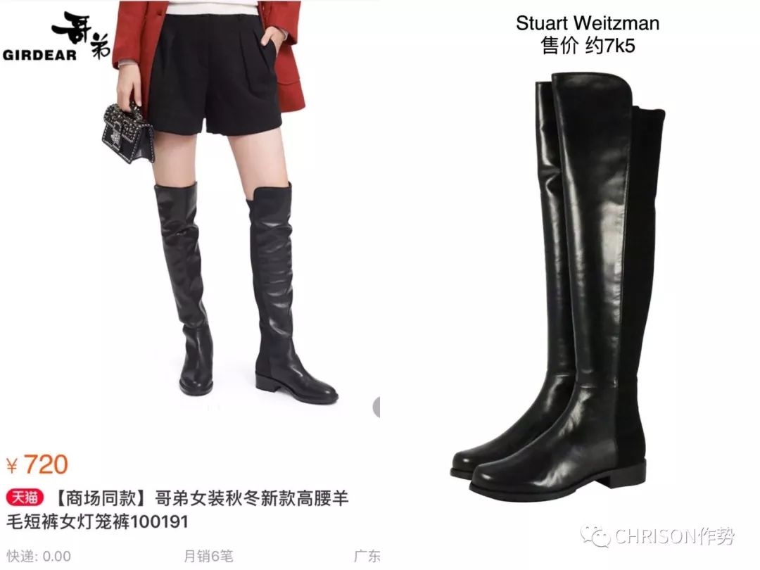 比如下面这双仿Stuart Weitzman 5050的长筒靴,就特意打上了【商场同款】(仿佛秀场同款)。