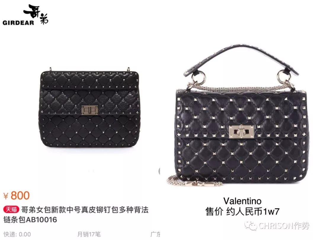 除了改变字母哥弟还会把不同奢侈品牌的特点结合起来,比如将Valentino铆钉包的锁换成了Chanel 2.55的锁头,就变成了“哥弟新款”。