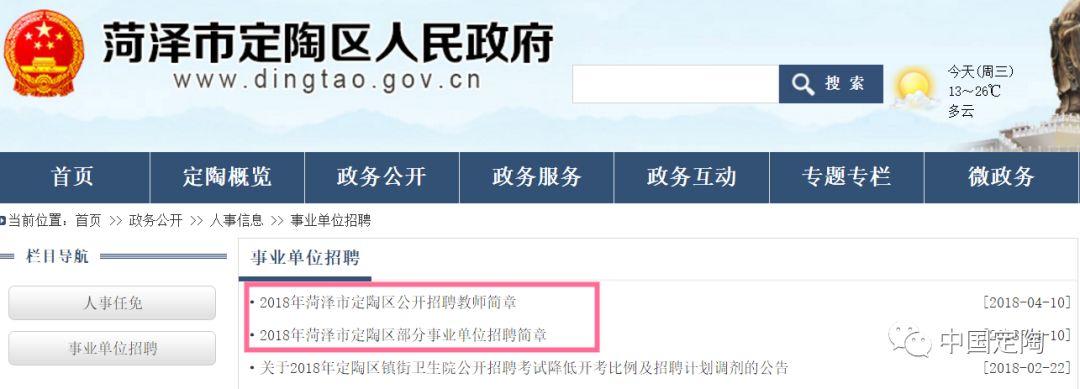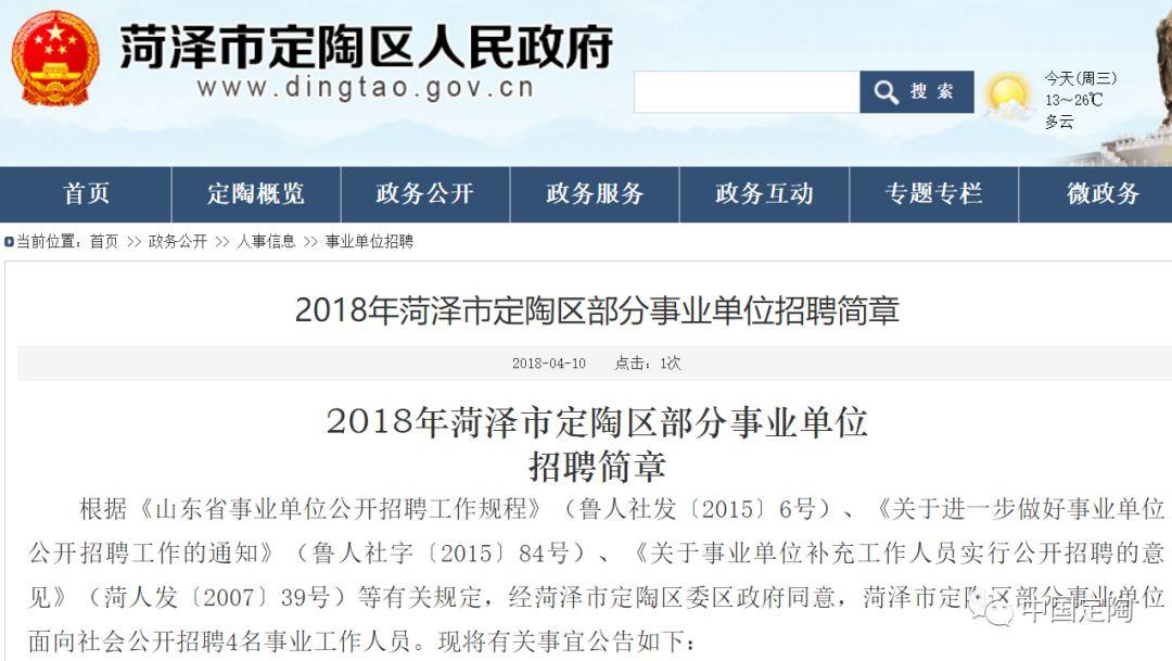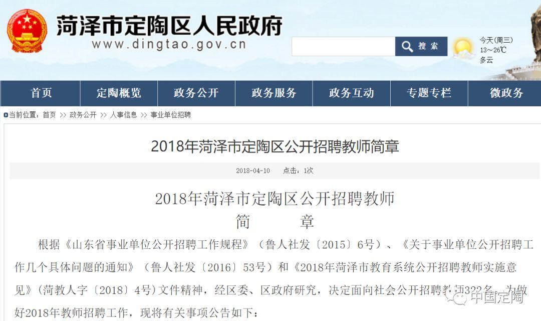 昨天,定陶区人民政府网发布《2018年菏泽市定陶区部分事业单位招聘简章》和《2018年菏泽市定陶区公开招聘教师简章》。
