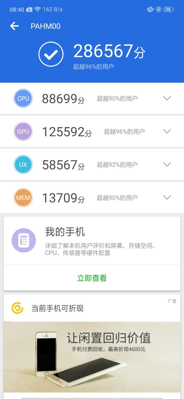 OPPO Find X *博兰**基尼版的安兔兔跑分超过28万,此成绩雄冠安卓阵营,已是当前极致性能的代表。