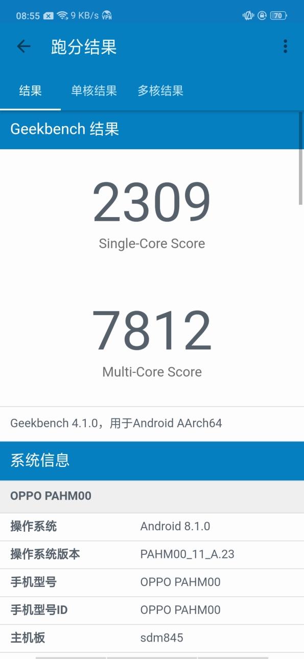 OPPO Find X *博兰**基尼版的GeekBench跑分。