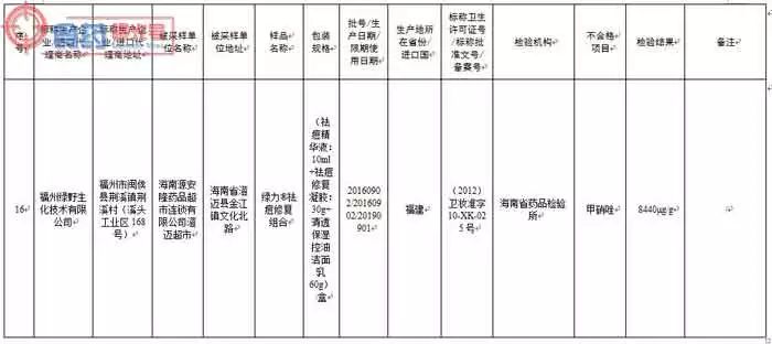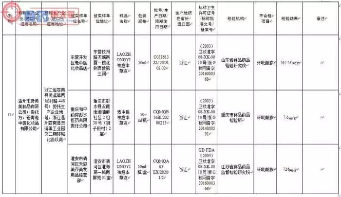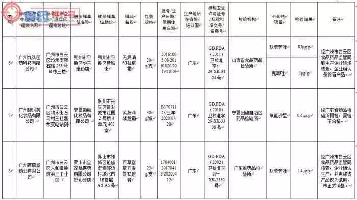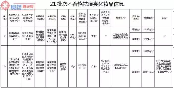 涉及的标示生产企业、不合格产品为:香港飛籽莊科貿有限公司生产的百達·春天®祛痘植物精華素,广州名妆化妆品制造有限公司(委托方:山东佰草慕商贸有限公司)生产的佰草慕清爽控痘霜,广州市雅兰丝化妆品有限公司(委托方:中法合资深圳市星孜化妆品有限公司)分装的医圣芦荟胶,广州市卓奥精细化工有限公司生产的卡尔曼尼豆拜拜祛痘抑脂软膏,广州市黛芬化妆品有限公司生产的优莉雅清肌祛痘益肤霜,广州九弘医药科技有限公司生产的无痕消印祛痘霜,广州碧润美化妆品有限公司生产的芙妍莉战痘霜,广州百草堂药业有限公司生产的百草堂草方专效祛痘膏,广州植一堂生物科技有限公司(委托方:广州嘉瑷生物科技有限公司)生产的焕彩净痘舒颜霜, 深圳佳兴化妆品有限公司生产的巴黎欧莱雅化妆品祛痘修复霜, 广州市嘉梦化妆品有限公司生产的绿茶控油消印祛痘膏,广州市卡美奥化妆品有限公司〔委托方:中美合资芬妮(沈阳)国际化学有限公司〕生产的坊生原®忍冬祛痘原液和芬妮茶树原液,广州广德堂药业有限公司生产的白云山雪莲祛痘霜和今华芦荟祛痘霜,上海花宫化妆品有限公司生产的花宫痘痘修复膏,温州市奇美美肤品有限公司(委托方:苍南老中医化妆品有限公司)生产的LAOZHONGYI祛痘本草液和老中医祛痘本草液,福州绿野生化技术有限公司生产的绿力祛痘修复组合