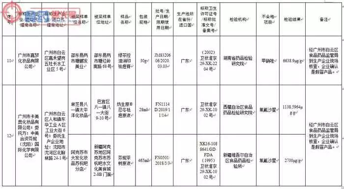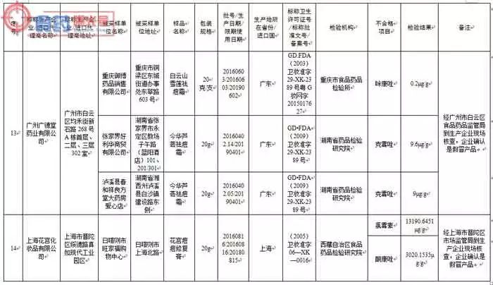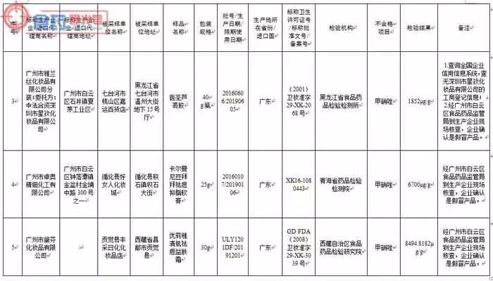 其中,经生产企业所在地食品药品监管部门现场核查,并经生产企业确认,标示广州名妆化妆品制造有限公司(委托方:山东佰草慕商贸有限公司)生产的佰草慕清爽控痘霜,广州市雅兰丝化妆品有限公司(委托方:中法合资深圳市星孜化妆品有限公司)分装的医圣芦荟胶,广州市卓奥精细化工有限公司生产的卡尔曼尼豆拜拜祛痘抑脂软膏,广州市黛芬化妆品有限公司生产的优莉雅清肌祛痘益肤霜,广州九弘医药科技有限公司生产的无痕消印祛痘霜,广州市嘉梦化妆品有限公司生产的绿茶控油消印祛痘膏,广州市卡美奥化妆品有限公司〔委托方:中美合资芬妮(沈阳)国际化学有限公司〕生产的坊生原®忍冬祛痘原液和芬妮茶树原液,广州广德堂药业有限公司生产的白云山雪莲祛痘霜和今华芦荟祛痘霜,上海花宫化妆品有限公司生产的花宫痘痘修复膏等相关批次产品为假冒产品。
