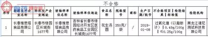 标称长春维思塔食品有限公司生产的花生汤圆,过氧化值(以脂肪计)检出值0.49g/100g ,标准规定为≤0.25g/100g。检验机构为黑龙江谱尼测试科技有限公司。