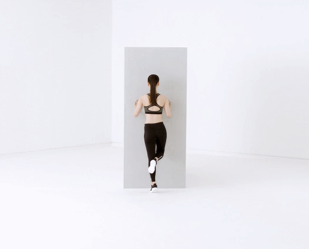 面向墙壁,屈肘扶墙,右脚支撑站立,左腿稍弯曲,左脚脚踝搭在右小腿上