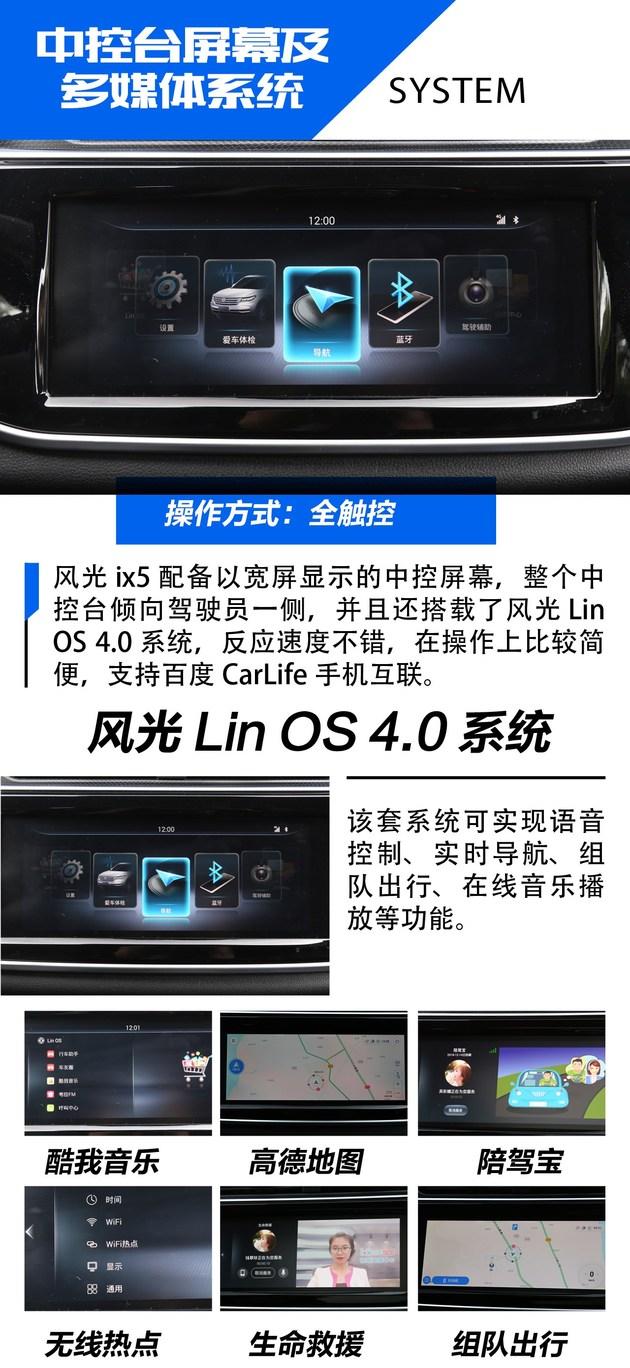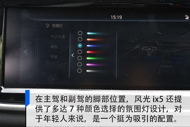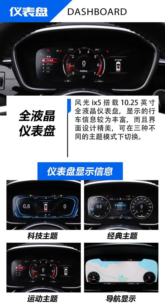 除此以外,风光ix5还配备有电子驻车、自动启停、车身雷达、陡坡缓降、车道偏离提醒等实用配置。