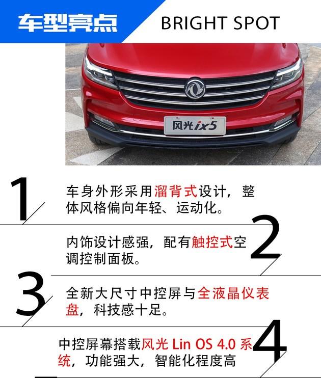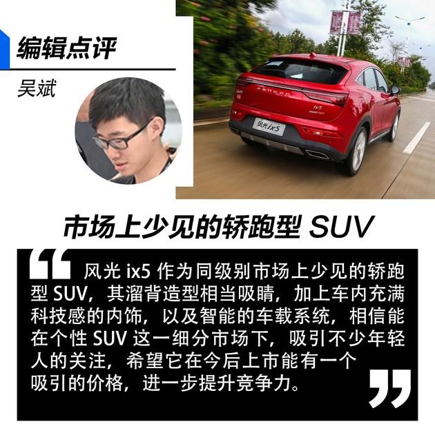 易车抢先试驾东风风光早年间以商用车起家,这些年也投入到了乘用车的造车行列中来,推出了风光580、S560等SUV车型,但是常规的SUV早已满足不了如今多元化的市场需求,因此在如今年轻、运动化的设计趋势引领下,东风风光带来了一款全新的轿跑SUV车型——风光ix5,它的目标很明确,就是为着年轻而来。